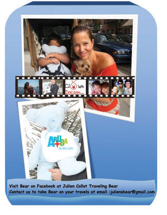 This year's fund raising campaign organized by Aruba Clown Doctors is centered around Julien Collot's Traveling Bear. The efforts of the fund raiser is to bring awareness to Children with Cancer. The focus of Julien Collot's Traveling Bear is to encourage Arubian travelers to take the bear on their upcoming journey's during this year. Julien Collot's Traveling Bear does not only include international travels, but he can be invited for day out on Aruba, documenting his island visits as well.
