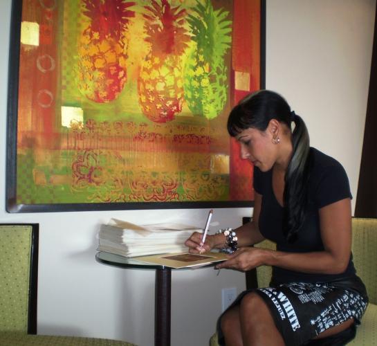 Elisa Lejuez in the Tradewinds Club Lounge signing her lithographs for guests. |