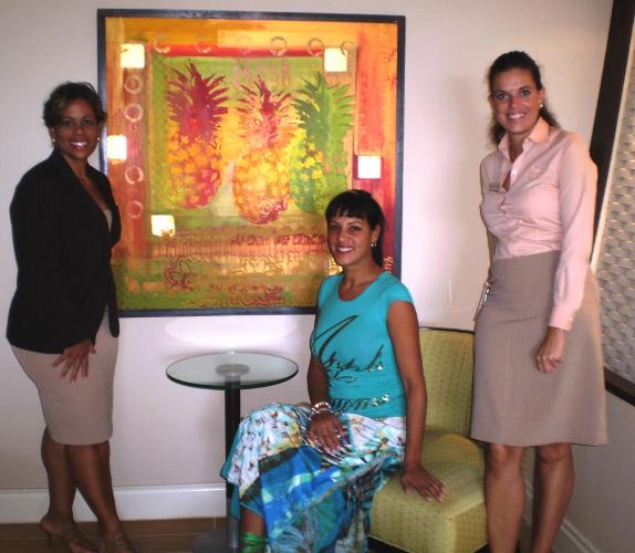 Elisa Lejuez (sitting) posing with Marriott’s Bettina Gonzalez and Karin Swiers in front of one of her own paintings in the Tradewinds Club Lounge. |
